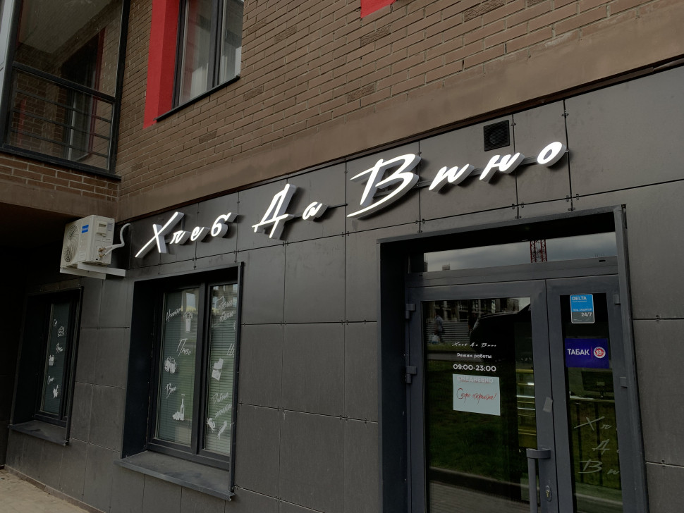 Изготовление и монтаж объёмных световых букв на подрамнике для ресторана "Хлеб да вино". Лицевая часть выполнена из акрила, торцы из алюминиевого профиля, задняя стенка - ПВХ. Подсветка - светодиодные модули.