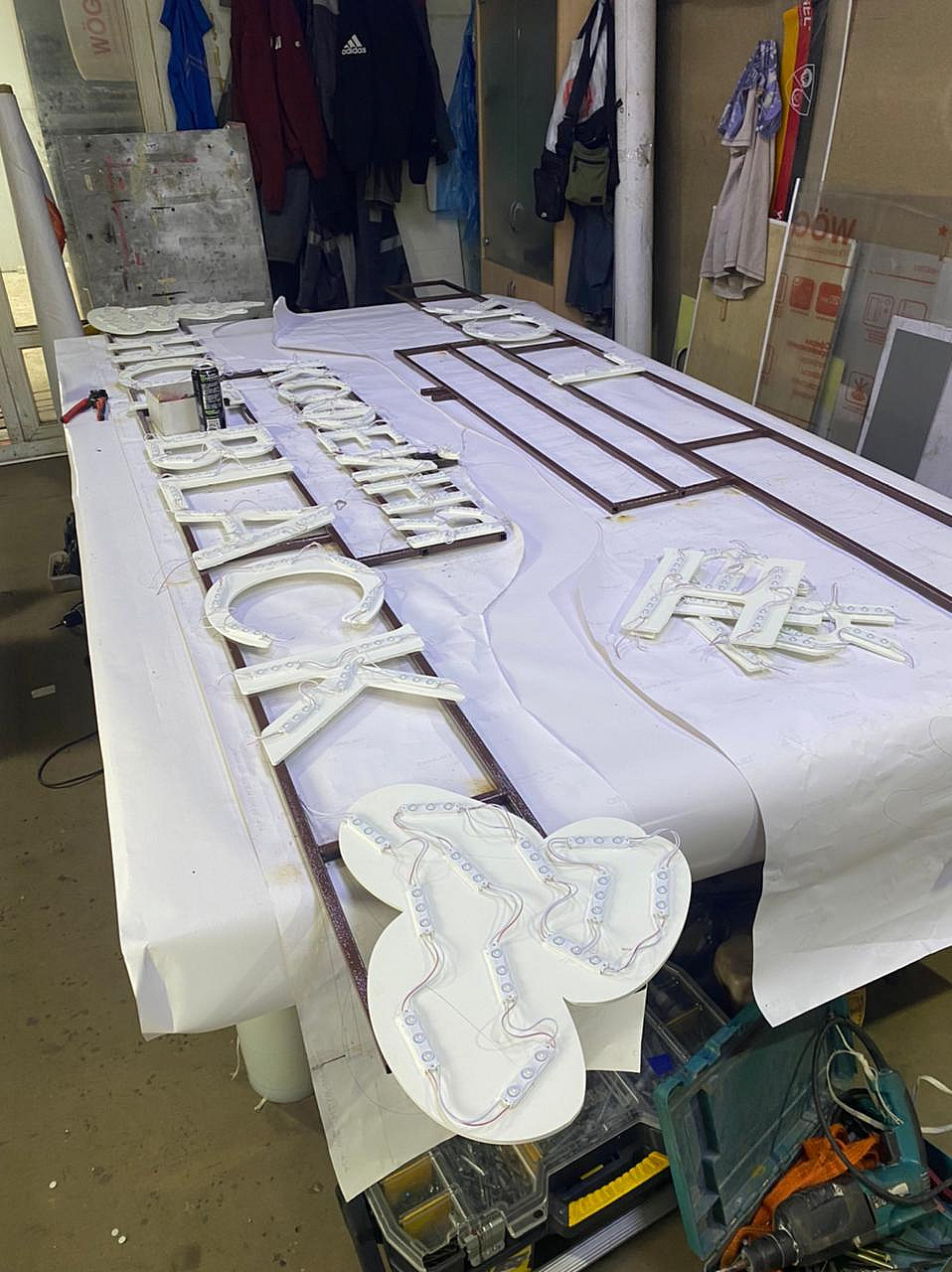 Изготовление и монтаж объёмных световых букв без подложки для кофейни "HOT BLACK". Лицевая часть выполнена из акрила, торцы из алюминиевого профиля, задняя стенка - ПВХ. Подсветка - светодиодные модули.